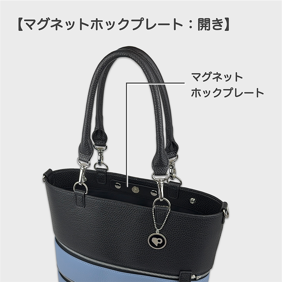トップパーツの内側にホックで留めることで、バッグの開口部分を広げたままの形状(容積を増加させた形状)にしても、開け閉めして使うことができるようになるパーツです。