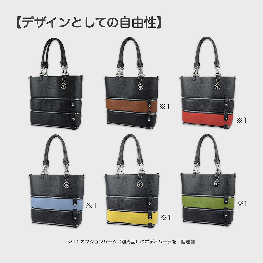 着脱可能なパーツによって形やデザインを自分で自由にカスタマイズしながら用途に合わせて使い続けることができるギミック(仕掛けのある)バッグです。