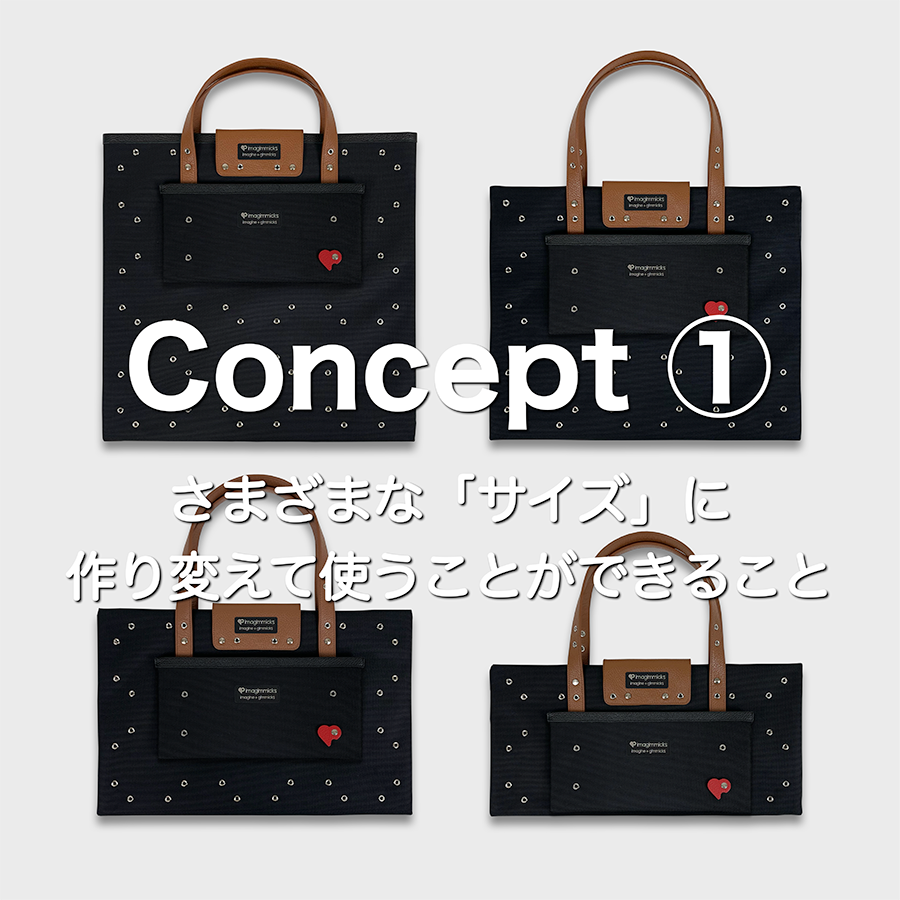初めて何かしらのカタチを作るときには、袋を折ったりネジ式留め具で固定したりと少し手間を感じる所もあるかもしれませんが、「どんな感じに使おうかな?」「こんな形にしてみようかな?」など想像と手間を経て形にしたバッグには、その人にしかない「想い入れ」のようなものも感じていただけるのではと考え、商品化しました。